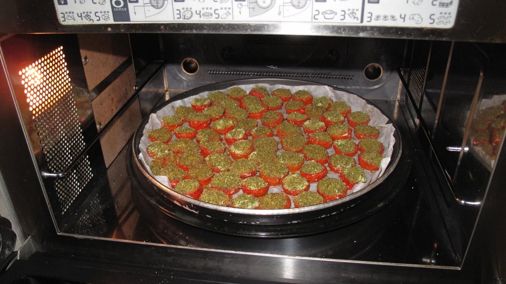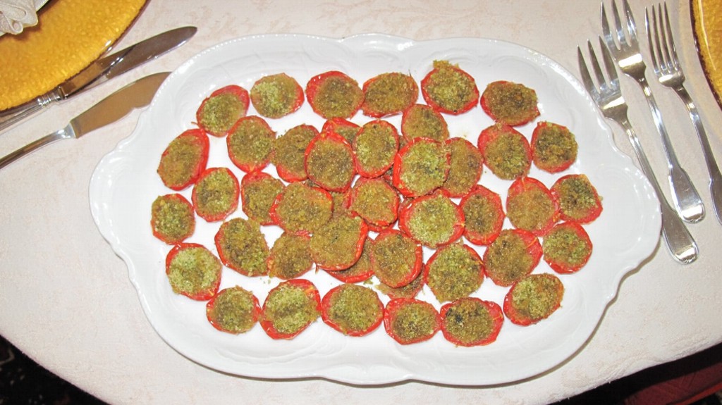 di grandezza normale, tagliati in due e farciti con pane grattugiato e prezzemolo, un filo d'olio e passati in forno. Nulla di strabiliante, se vogliamo, ma questi pomodori erano particolarmente gustosi e ogni tanto si mangiavano in