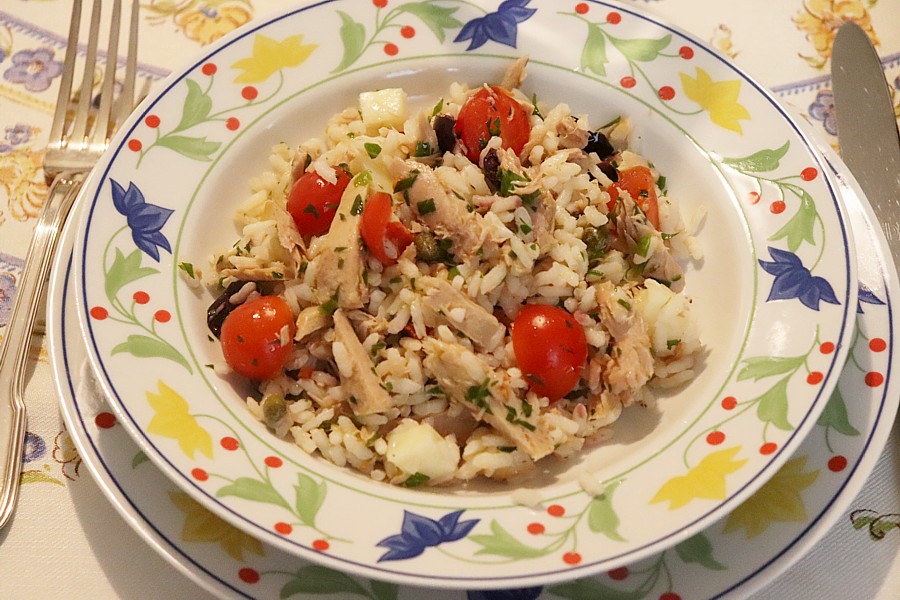 In teoria sull'insalata di riso o non si beve niente oppure si può bere qualunque tipo di vino. Io, forse per la presenza del tonno, ho privilegiato il vino bianco e per l'esattezza un