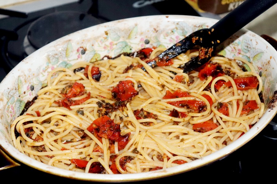 - Mettere a bollire l’acqua e cuocere gli spaghetti al dente, scolarli e ripassarli nella teglia con il condimento;