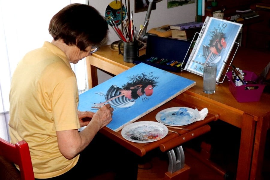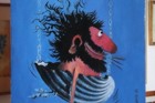 FB cioè Fausta Braccesi mentre sta dipingento il Matto delle Conchiglie Divinatorie che entrerà a far parte della mia collezione