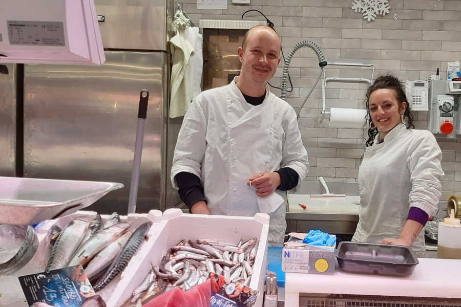 Carlo e Veronica presiedono il box del pesce al PAM di via Biondi.