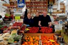 Marco, Danila ed Emanuela sono orgogliosi del loro banco di frutta e verdura.