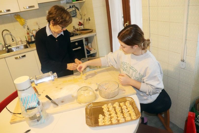 Fausta e Chiara impegnate nella confezione dei cappelletti che saranno il piatto d'onore