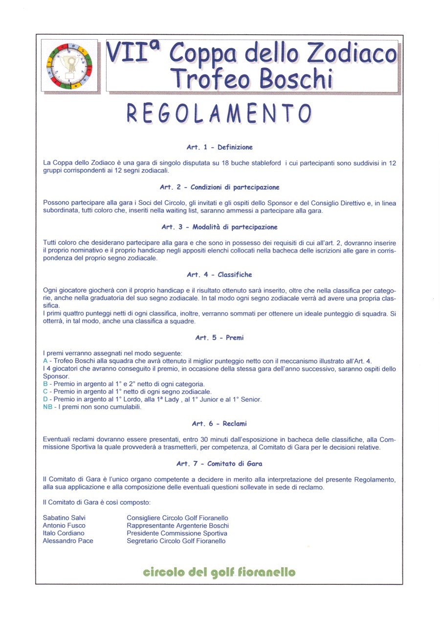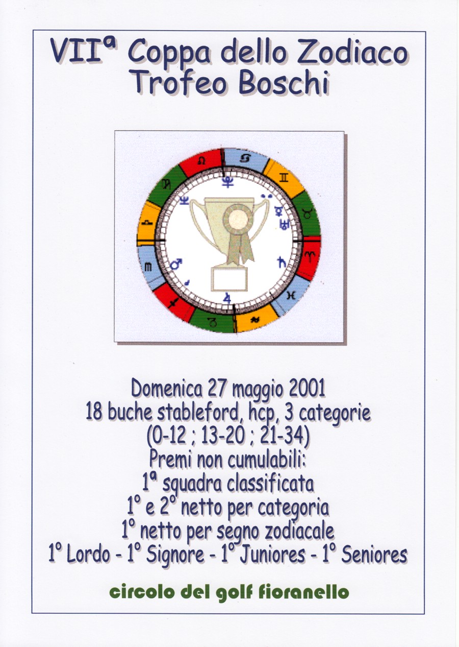 oroscopi e sull'astrologia in genere. Avevo sempre pensato che una gara di golf ha un certo successo se riesce a premiare il maggior numero possibile di persone. Quid melius che inventare una gara nella quale, oltre ai classici premi legati alla classifica per categorie, ci fossero dei premi attinenti alla natura dei giocatori? E cosa c'è di più personale del segno zodiacale? Detto fatto si trattava di trovare lo sponsor e il caso volle che l'Agip Petroli, in quel periodo, stesse |