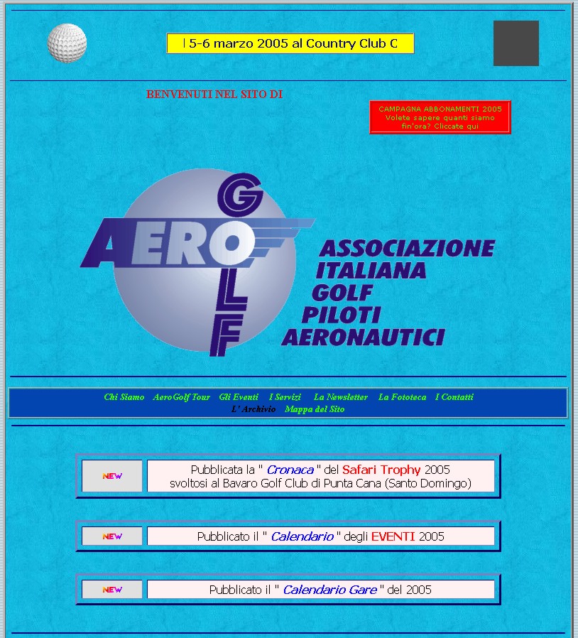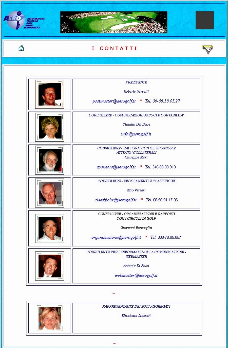 luogo presso il Country Club Castelgandolfo già nel 2002. Particolare enfasi venne data al turismo golfistico tanto che i soci dell'Aerogolf ebbero modo, negli anni, di recarsi a giocare non solo in campi da golf di tutt'Italia ma anche all'estero. Per il periodo in cui io collaborai con la struttura organizzativa dell'Associazione, ricoprendo la carica di webmaster e di consulente per la comunicazione e l'informatica, assicurai anche i servizi fotografici che ebbero una loro sede specifica nella sezione "Fototeca" del sito internet. Mi sento particolarmente lusingato e onorato di essere ancora annoverato fra i Soci Onorari dell'Associazione. |