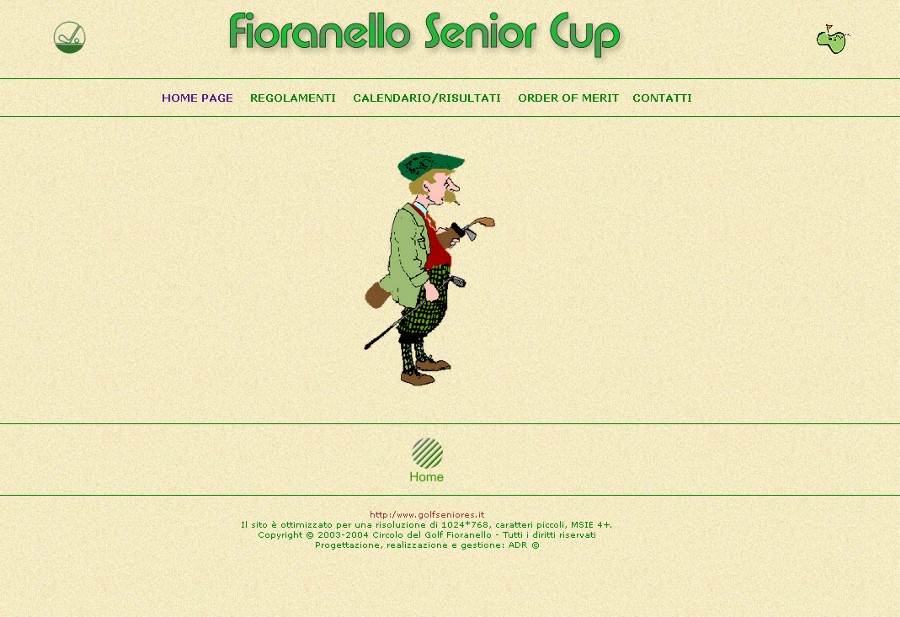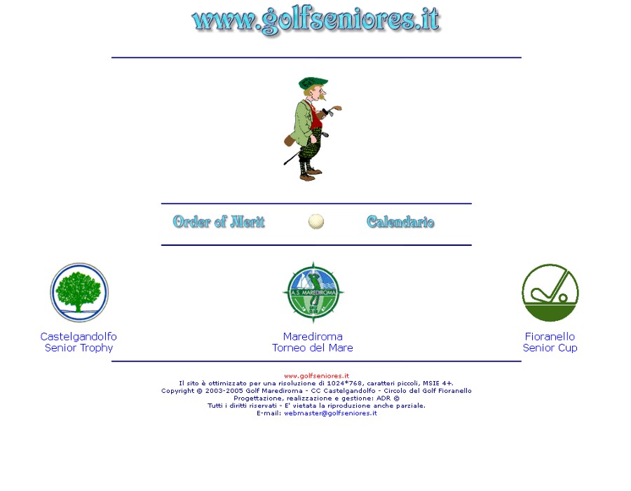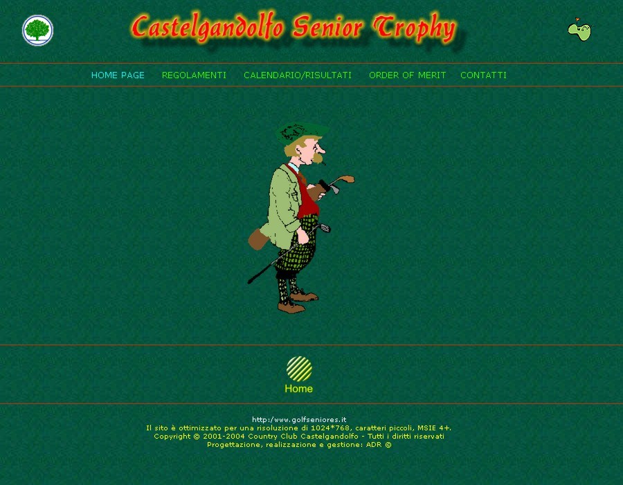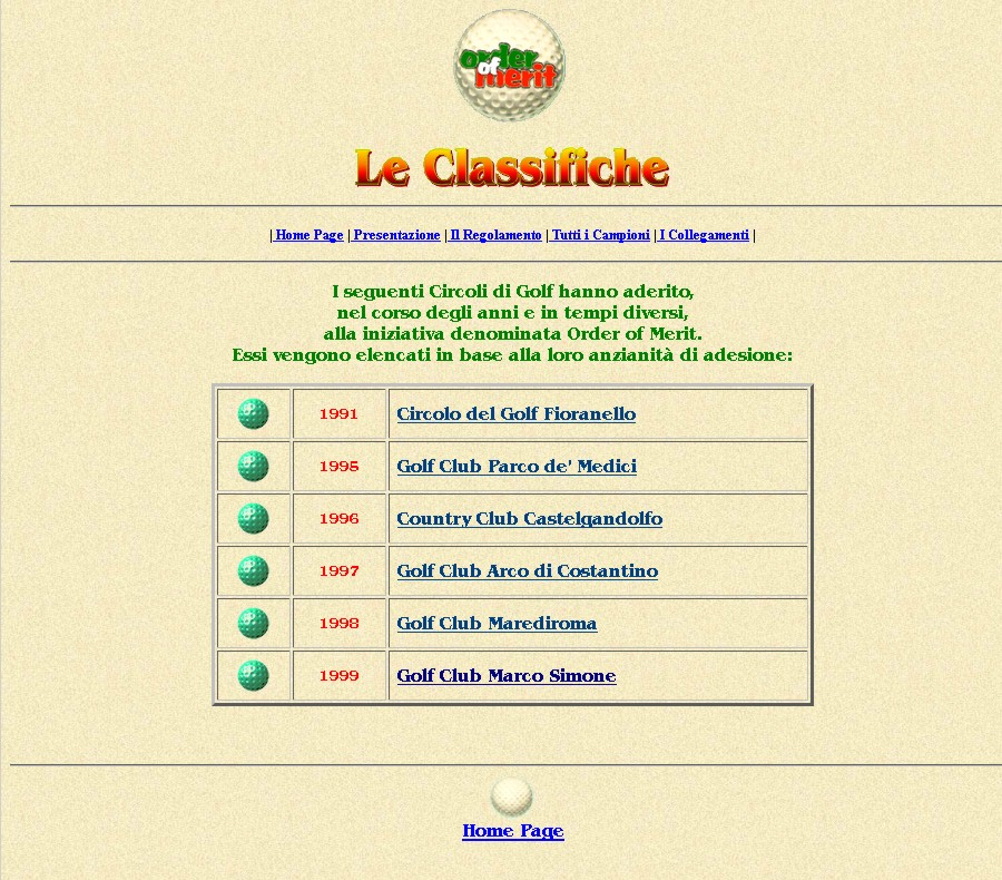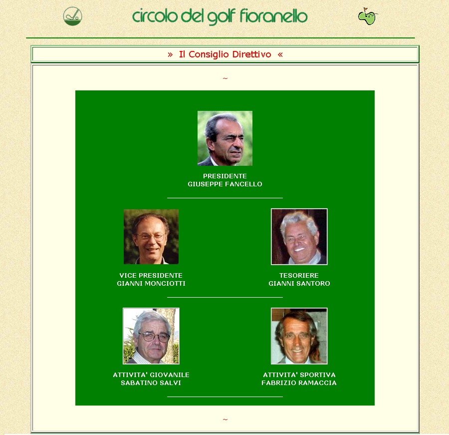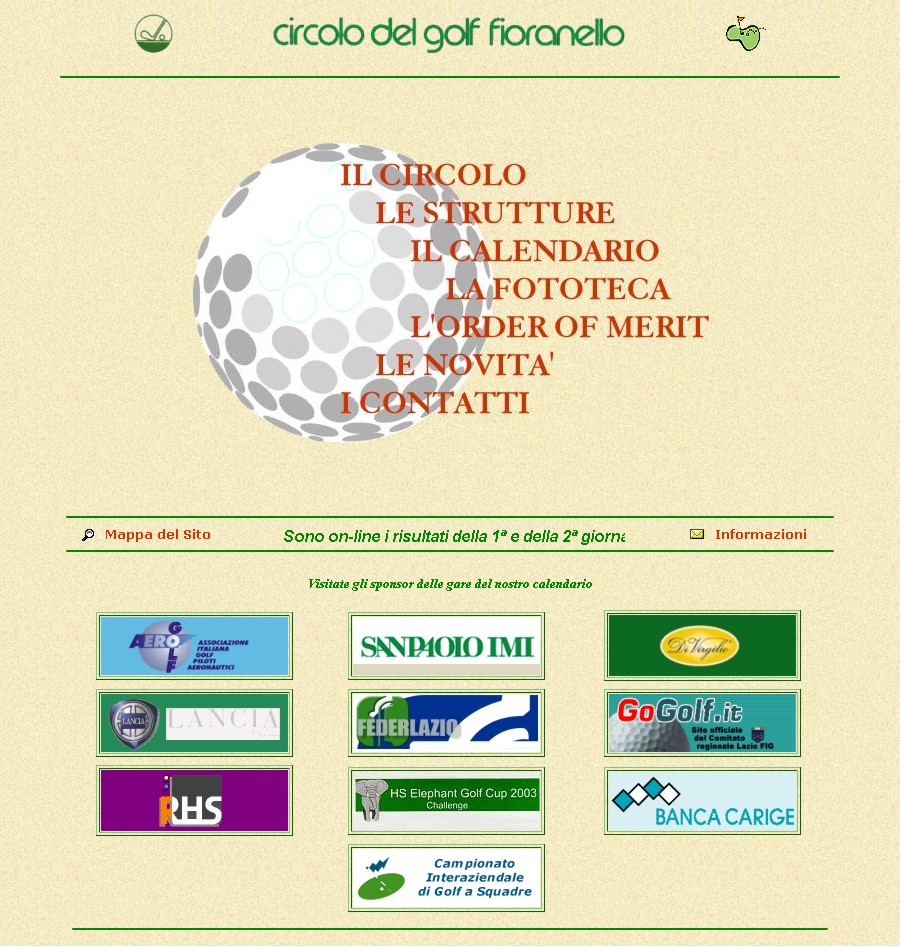 Alla legittima soddisfazione di aver creato i primi siti internet per il Campionato Interaziendale a Squadre, per l'Order of Merit, per il Senior Trophy, per l'Alitalia Golf Club e per l'Aerogolf, si aggiunge per ultima, ma non ultima, quella di aver creato il primo sito internet per il Circolo del Golf Fioranello. Cose che, come tutto ciò che appartiene all'informatica, hanno una durata relativa nel tempo, superate dalle sempre più evolute tecniche di "web design". | |