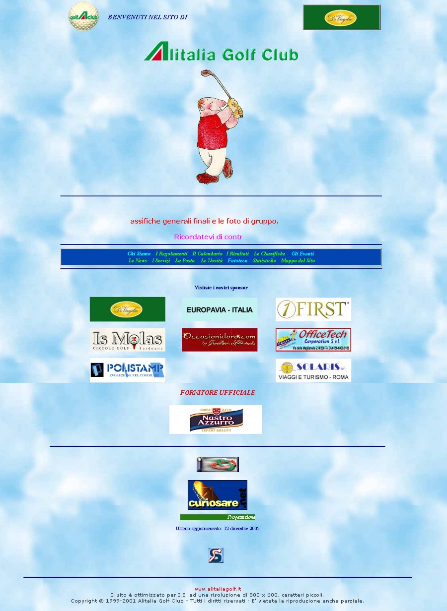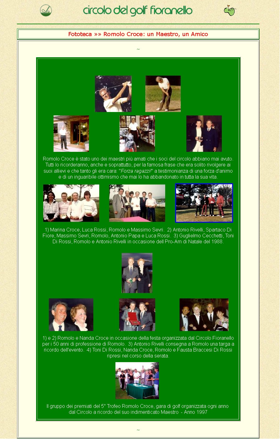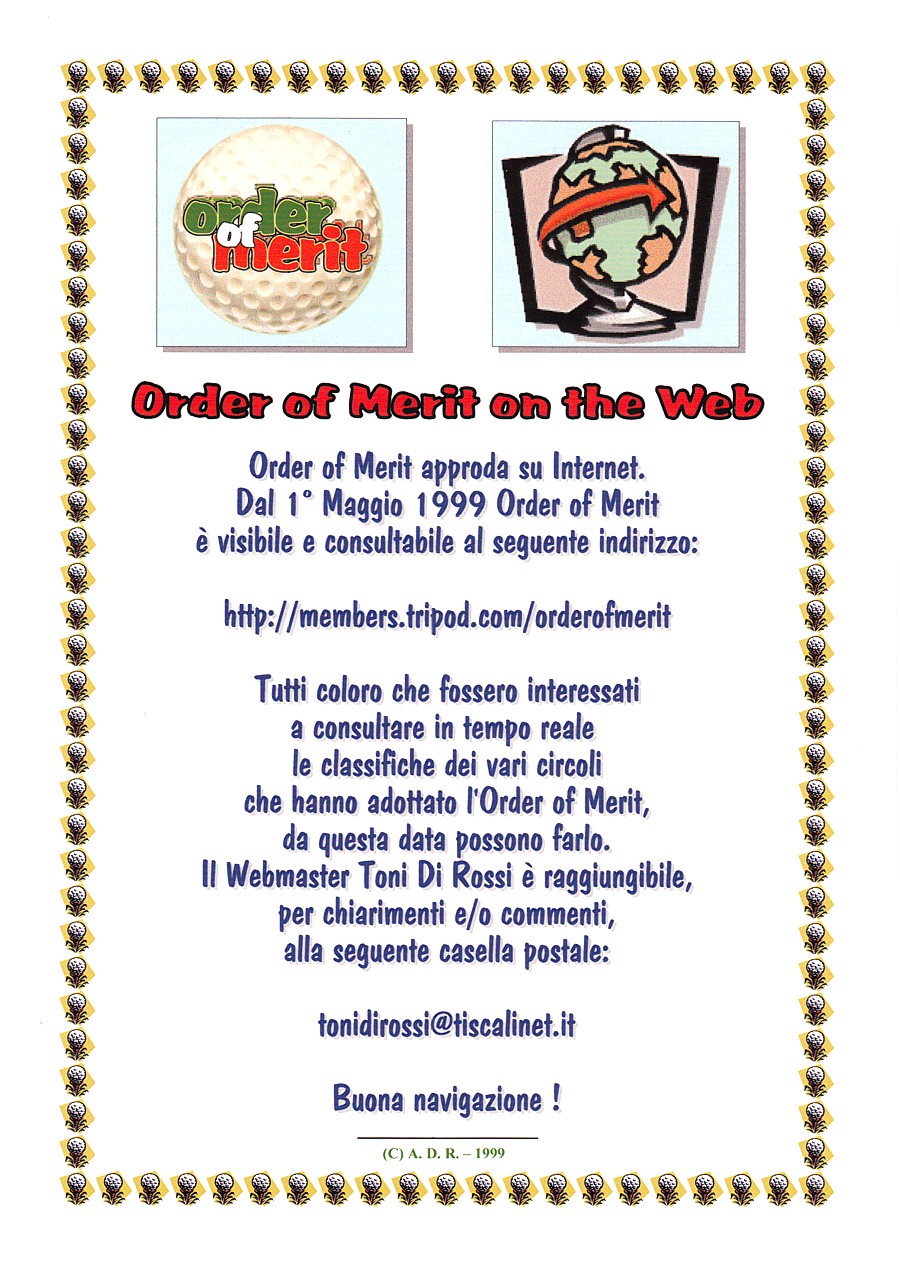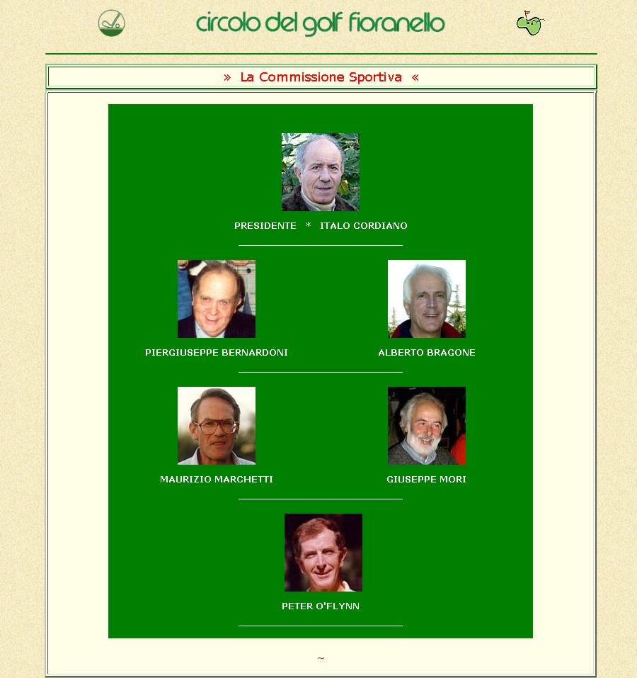 Alla legittima soddisfazione di aver creato i primi siti internet per il Campionato Interaziendale a Squadre, per l'Order of Merit, per il Senior Trophy, per l'Alitalia Golf Club e per l'Aerogolf, si aggiunge per ultima, ma non ultima, quella di aver creato il primo sito internet per il Circolo del Golf Fioranello. Cose che, come tutto ciò che appartiene all'informatica, hanno una durata relativa nel tempo, superate dalle sempre più evolute tecniche di "web design". | |