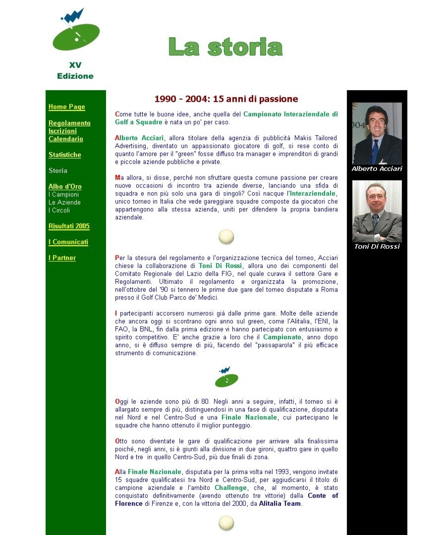 facenti parte della stessa azienda, io gli preparai il regolamento del "Trofeo Makis Interaziendale di Golf a Squadre", questo il nome del primo torneo aziendale. Alberto Acciari, poi, mi chiese di assumere la presidenza del Comitato di Gara, carica che ho ricoperto per 15 anni, tanta è stata la durata di questo evento golfistico unico in Italia e mai più ripetuto. In concomitanza con l'organizzazione del torneo misi a punto il primo esemplare di sito internet attraverso il quale venivano diramate tutte le notizie inerenti alle gare che venivano disputate in tutta |