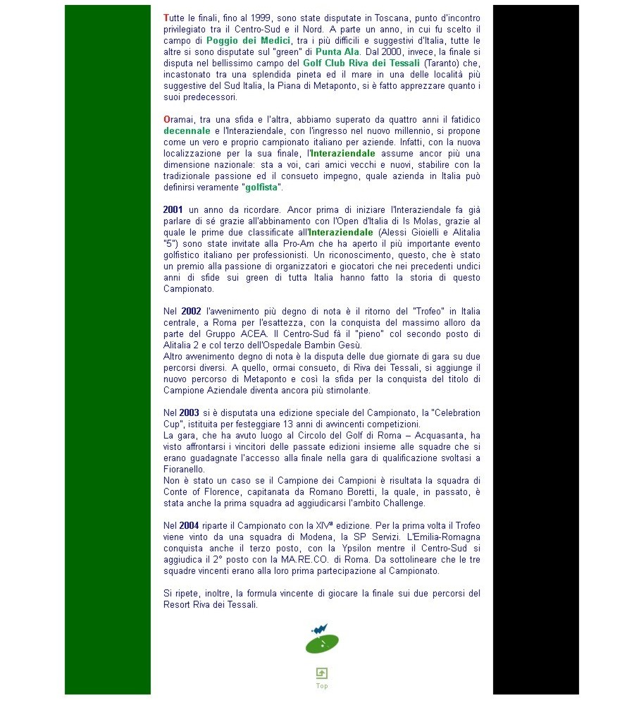 Italia unitamente ai risultati e alle classifiche. L'interesse suscitato da questa manifestazione, non appena lanciata, fu enorme. Negli anni successivi il torneo si stabilì anche in altre parti d'Italia, vedi Piemonte, Triveneto, Toscana ecc. Nel corso della sua esistenza il torneo assunse anche il nome di "Open Interaziendale a Squadre" in concomitanza della sponsorizzazione di Diners Club International, prima di assumere il definitivo nome di "Campionato Interaziendale di Golf a Squadre". Contemporaneamente sorse il desiderio e/o la necessità di programmare una finale nazionale, che desse modo alle migliori squadre classificatesi di gareggiare per vincere il relativo trofeo. La prima finale nazionale ebbe luogo a Punta Ala, un vero punto d'incontro per tutti nell'Italia Centrale; successivamente ci fu una finale a Poggio dei Medici, sempre in Toscana, per approdare, alla fine, a Riva dei Tessali dove ebbero luogo le ultime finali nazionali. In 15 anni di attività hanno preso parte a questo evento oltre 150 aziende che hanno messo in campo più di 200 squadre per un totale di oltre 1000 giocatori |