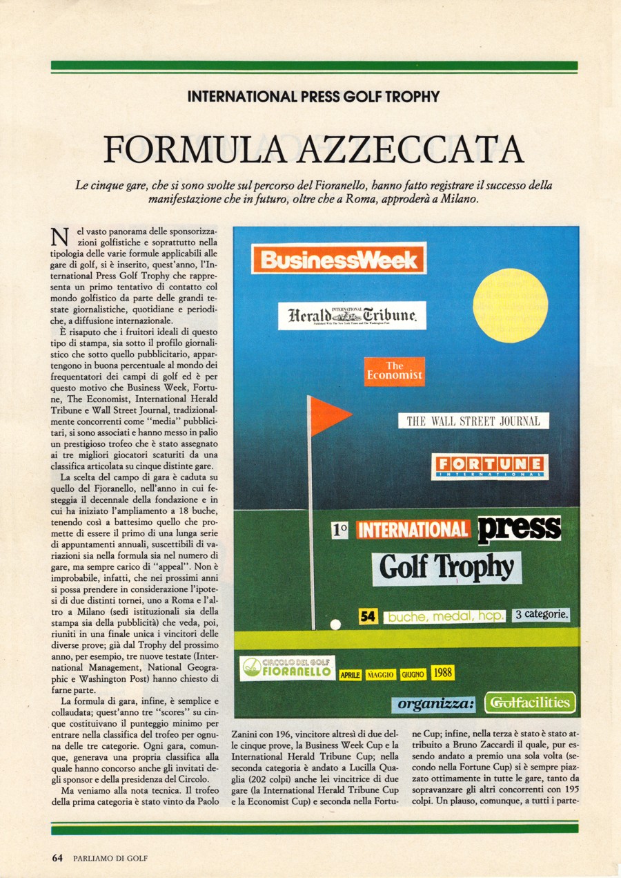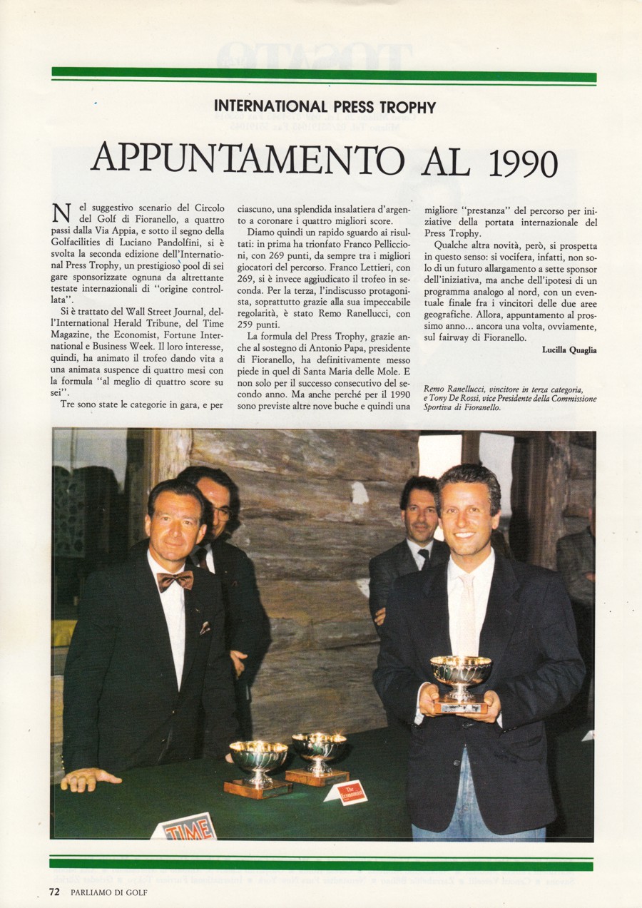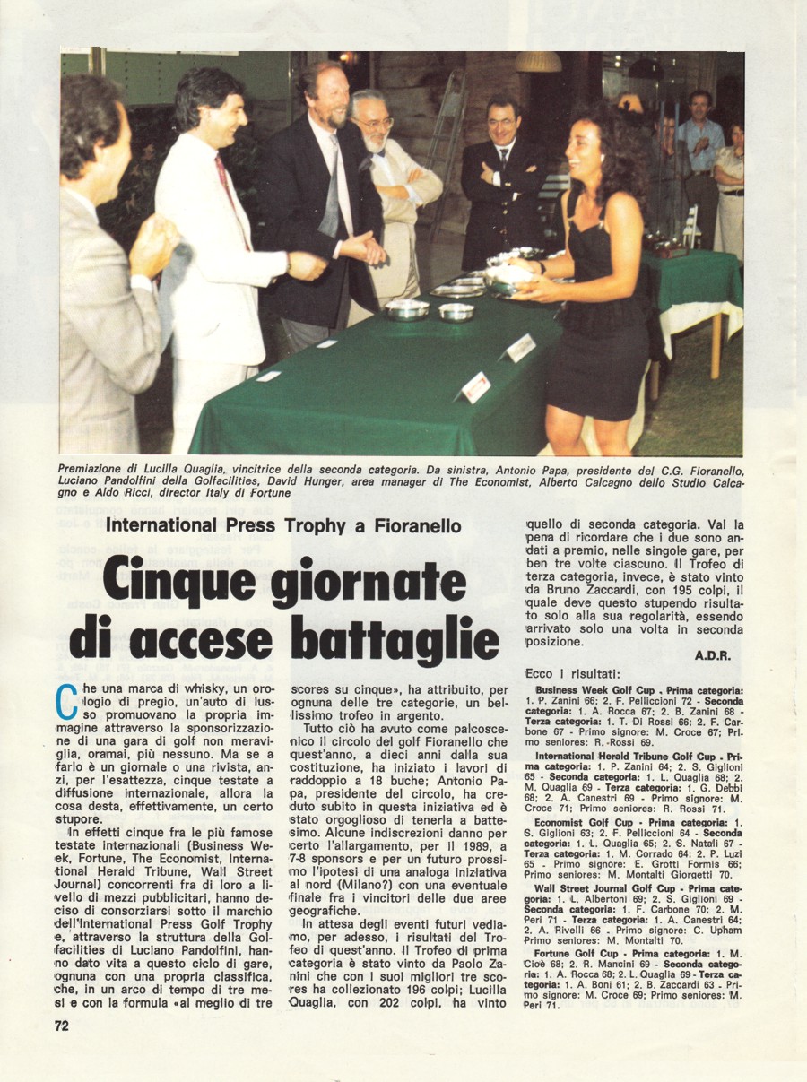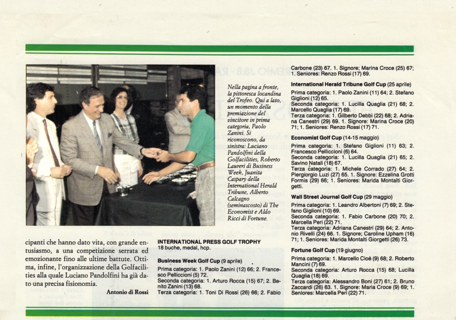 Fortune International, Aldo Ricci, che si dimostrò entusiasta a sua volta e decise di partecipare a qualunque iniziativa si decidesse di fare in quel settore. Successivamente anche altri esponenti della stampa internazionale, con i quali intrattenevo rapporti di lavoro, vennero a conoscenza della cosa e non solo si dissero entusiasti di partecipare ma, quasi, si sarebbero offesi se li avessi esclusi da questa "operazione"; il loro prestigio ne avrebbe sofferto nei confronti delle testate concorrenti. Fu così che oltre a "Business Week" e "Fortune International" anche "International Herald Tribune", "The Ecomnomist" e "Wall Street Journal" aderirono all'iniziativa. Questa ebbe luogo nei mesi di aprile, maggio e giugno del 1988 e si decise di fare una premiazione unica alla fine delle cinque gare, cosa che avrebbe garantito una migliore visibilità della manifestazione. La stampa specializzata riportò con enfasi l'avvenimento e la cosa ebbe ampia risonanza nell'ambiente golfistico laziale. Molti soci di altri circoli, in occasione della disputa di una delle gare in programma, facevano a gara per iscriversi in tempo e partecipare a questo torneo. L'anno successivo anche la rivista "Time" si aggiunse alle consorelle e, a giudicare dal tavolo della premiazione con tutti i premi esposti, si può dire, a ragione, che si trattava, proprio, di una manifestazione ben riuscita. Alla fine della premiazione, poi, aveva luogo un ricevimento offerto dagli sponsor. |