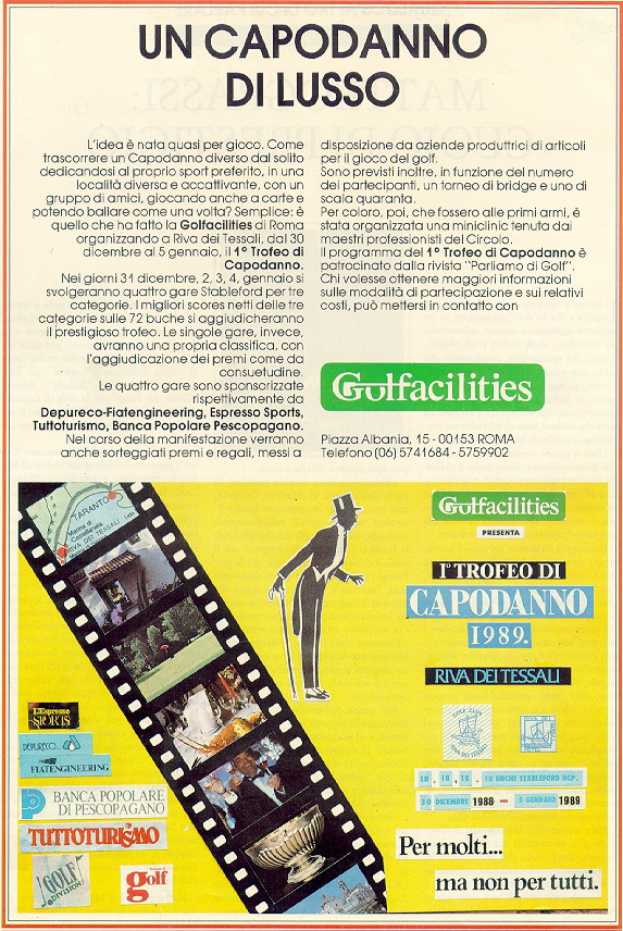 Era il mese di aprile dell'84 e Fausta ed io cominciammo a frequentare il circolo e a prendere lezioni di golf. I miei rapporti con Antonio Papa, ben presto, assunsero un aspetto quasi professionale in quanto fui richiesto di qualche parere su argomenti inerenti alla mia professione i quali, dopo un po', sfociarono addirittura in una richiesta di collaborazione. Venni cooptato nella Commissione Sportiva e mi fu chiesto di occuparmi del settore delle promozioni e delle sponsorizzazioni, materia oserei dire vitale per un circolo sportivo. Col tempo detti un notevole impulso a questo settore che portò al raggiungimento di importanti sponsorizzazioni dovute anche ai miei buoni rapporti col mondo della comunicazione. Infatti alcuni dei miei interlocutori professionali furono ben felici di fare il loro ingresso nelle sponsorizzazioni golfistiche il cui target di riferimento era esattamente in linea con il loro tipo di comunicazione. A questo proposito ricordo, fra le più note, l'International Press Golf trophy, e la Coppa Famiglia Cristiana. Nel corso della Presidenza di Antonio Papa venni cooptato nel Consiglio Direttivo e mi fu affidato il settore della promozione dell'attività sportiva, carica che mantenni fino alle elezioni successive quando Antonio Papa si dimise dalla carica di Presidente. Al suo posto, come Presidente, venne eletto Antonio Rivelli. |