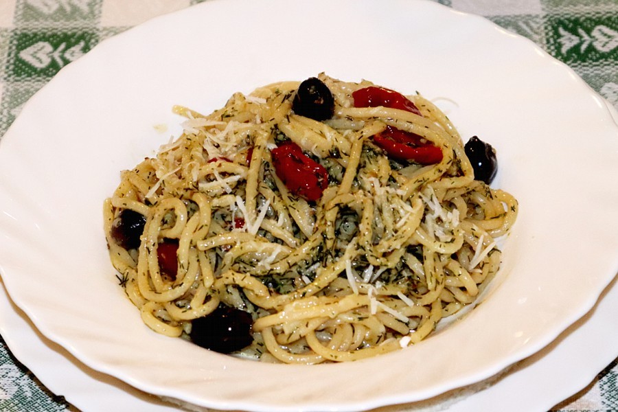 spaghetti il condimento, oltre che dal pesto, era costituito da pomodorini secchi e olive nere. Che dire? Era buonissimo!