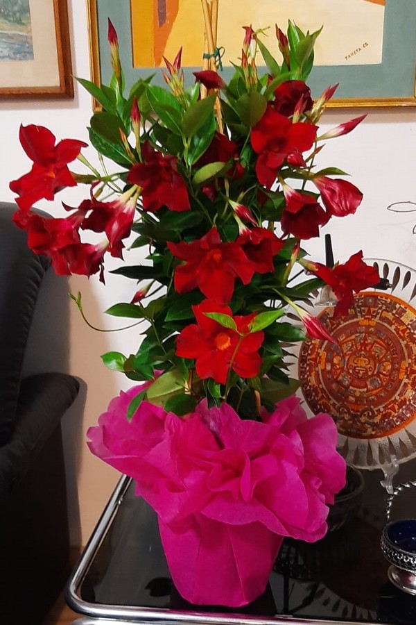 Tutto qui. Un pranzetto con due mamme. Stefania, Carlotta e Nicoletta Di Rossi hanno regalato alla Nonna/Mamma una bellissima pianta di un fiore che non conoscevamo: una Mandevilla Iaxa che tradotto in linguaggio non botanico vuol dire