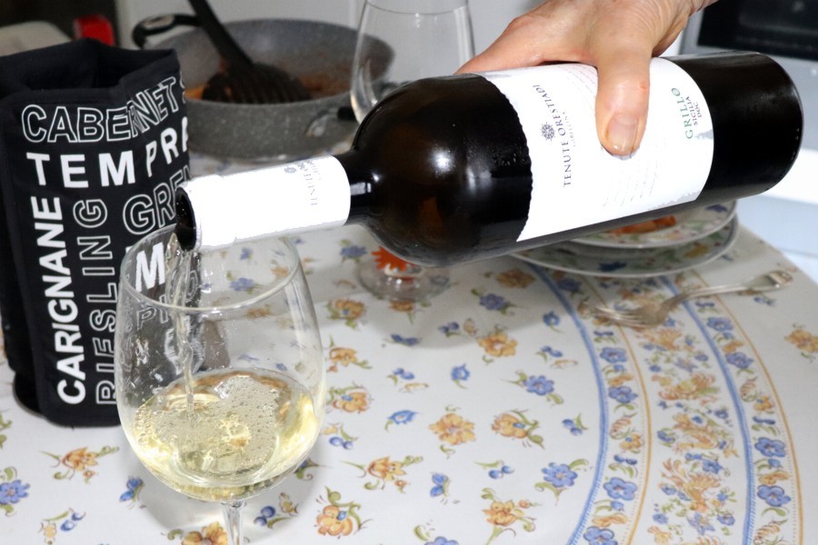 richiede solitamente un vino bianco come una Falanghina, deciso e persistente, o, per rimanere in Sicilia, un Grillo." Ebbene il Grillo fa parte, normalmente, della mia cantina per cui...