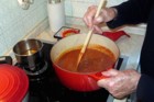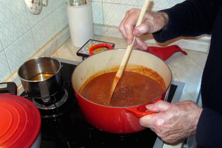 - Fate cuocere, coperto, a fuoco lento, per circa 3 ore. Se durante la cottura il pomodoro tende ad asciugare troppo, aggiungete 1 mestolo di brodo di dado. Quando manca un mezz'ora al termine della cottura aggiungete al sugo il rametto