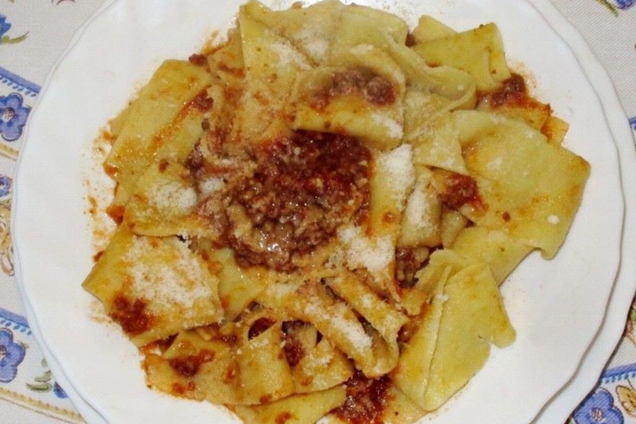 - Lessate le pappardelle in abbondante acqua salata, scolatele e trasferitele in una zuppiera, versate il ragù bollente e mescolate.