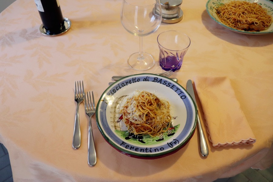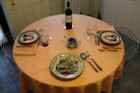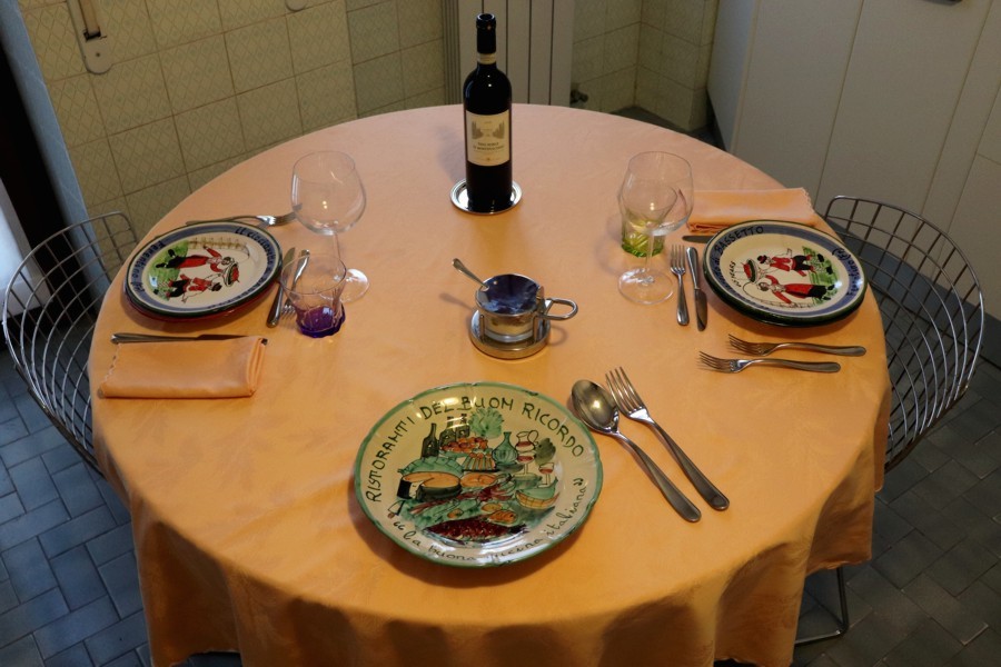 La tavola imbandita con i piatti del Buon Ricordo. Sono presenti i 2 piatti del Bassetto "conquistati" il giorno del convivio.