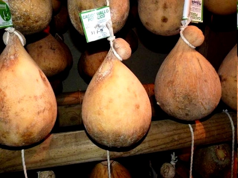 "Il caciocavallo è un formaggio stagionato a pasta filata tipico dell'Italia meridionale di forma tondeggiante, a "sacchetto", prodotto con latte particolarmente grasso di vacche podoliche, con l'aggiunta di solo caglio, fermenti lattici