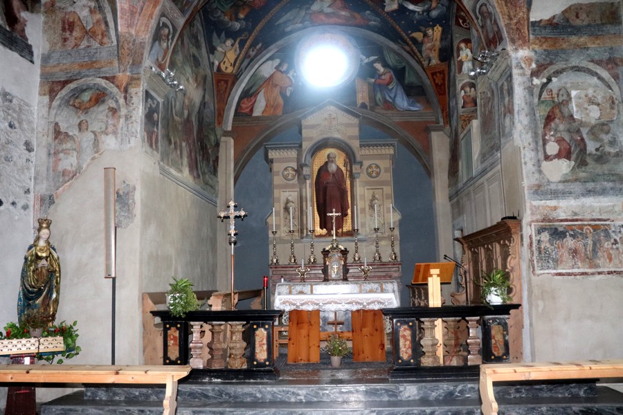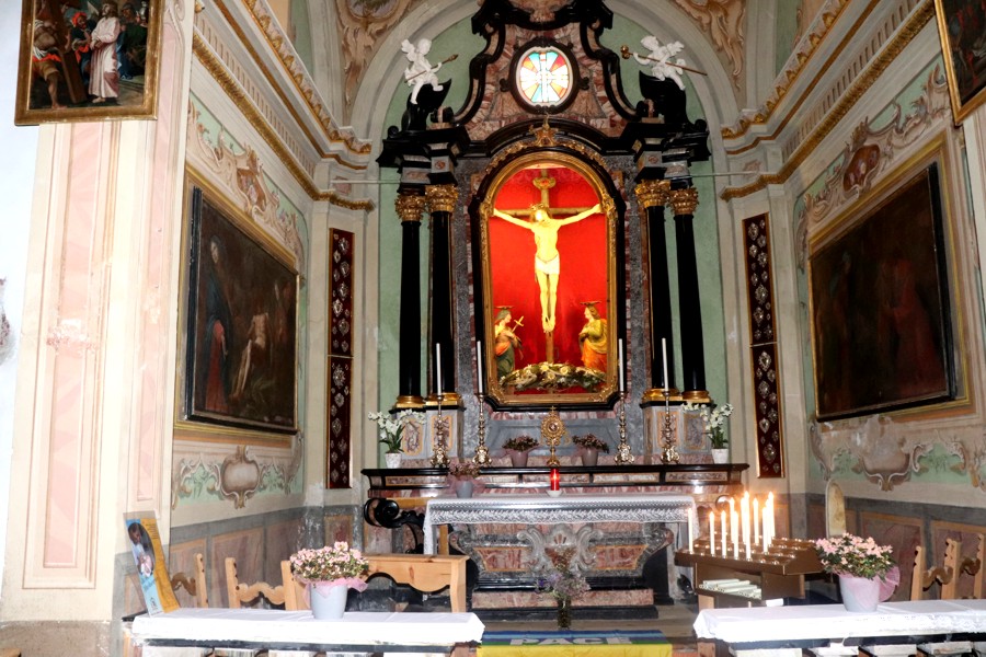 Sopra l’altare principale, decorato dal milanese Eugenio Ponzio, è presente una pala che si attribuisce all’artista bormino Carlo Marni (1632).