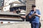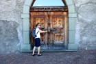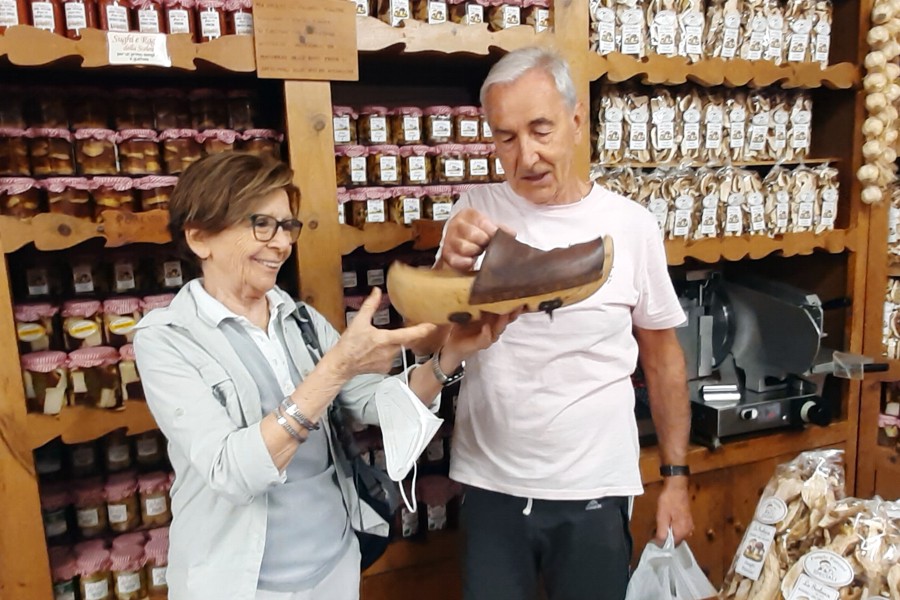 Fausta è estasiata di fronte ad un antico paio di zoccoli in legno, tipici della valle.