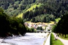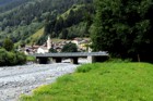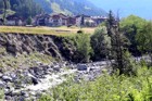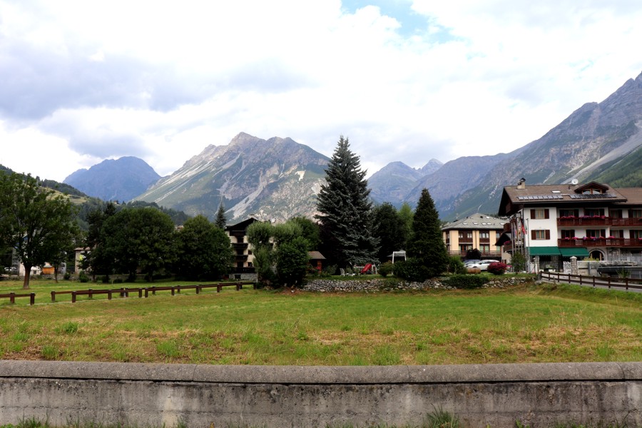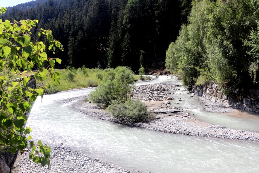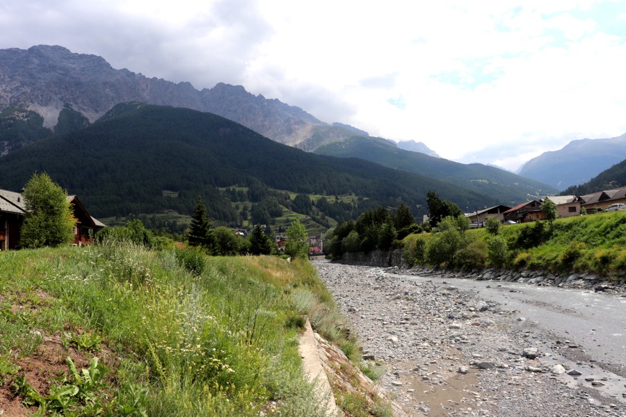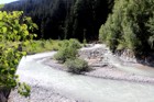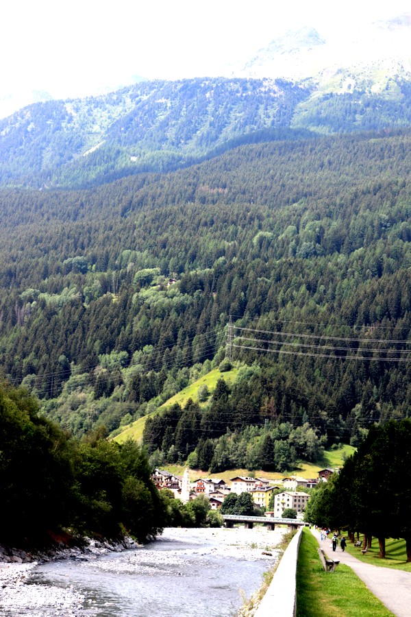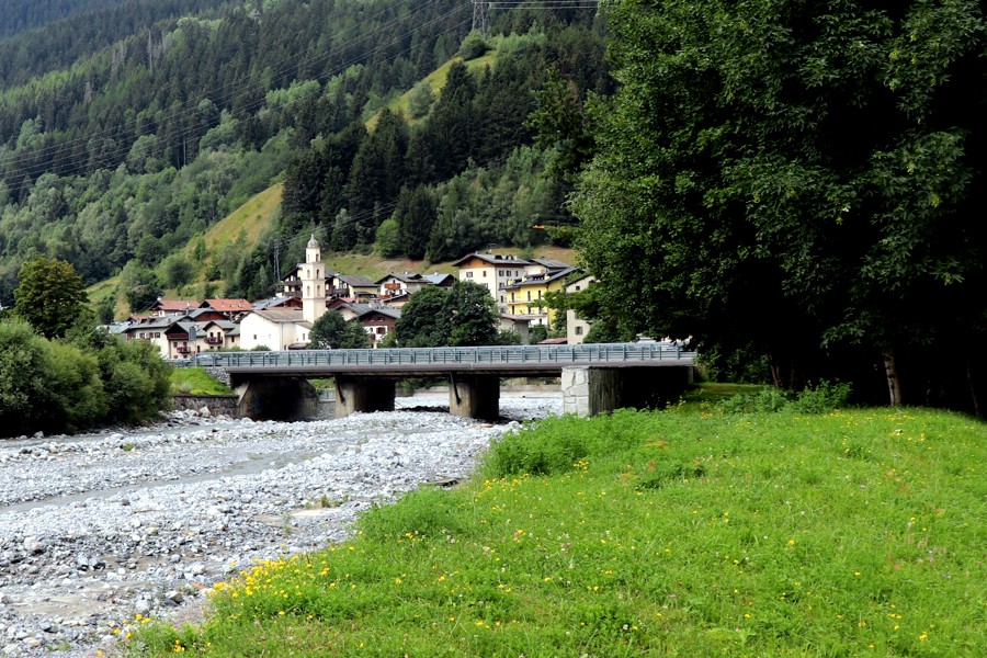 Sullo sfondo le montagne alle spalle di Bormio. Il Frodolfo, qui, è decisamente in secca.
