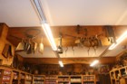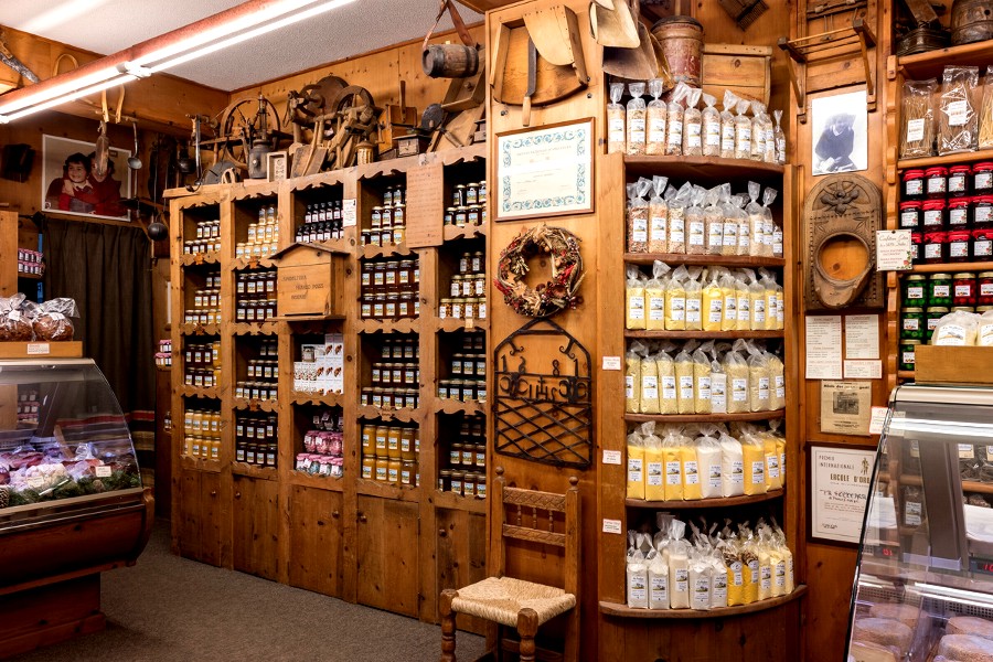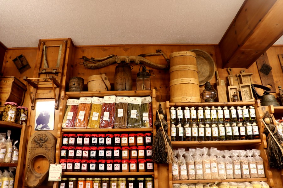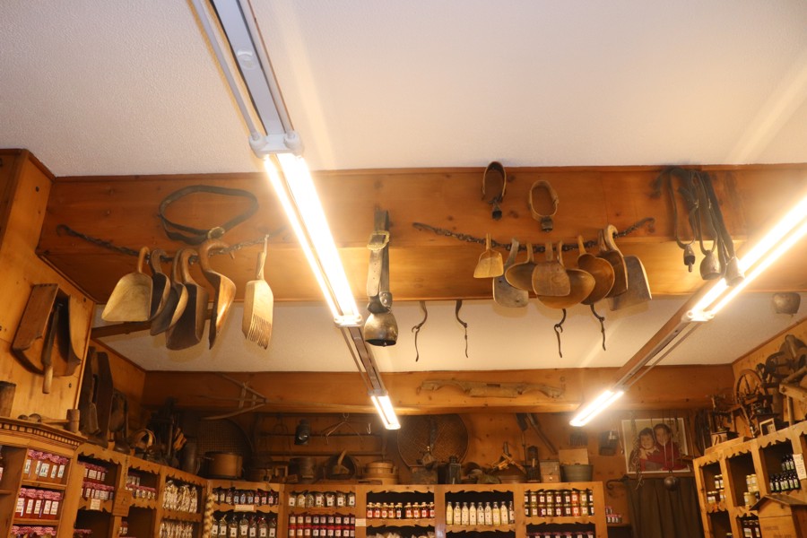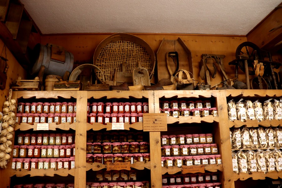La Sceleira.Interno del negozio. Sulla parte superiore degli scaffali c'è una mostra di antichi manufatti della valle raccolti personalmente da Franco Pozzi.