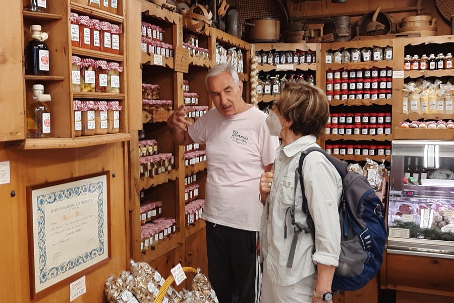 Franco Pozzi, il titolare, spiega a Fausta come vengono fatte le sue salsine per i crostini.