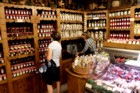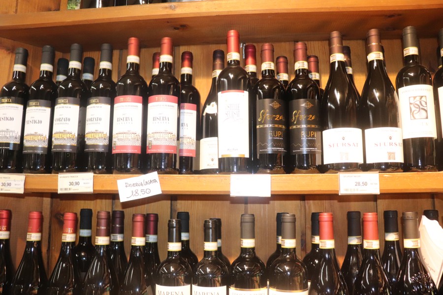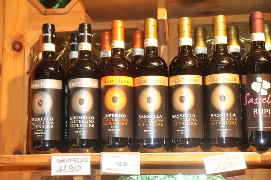 La Sceleira. Interno del negozio. Uno scaffale con una bella selezione di vini dellla Valtellina.