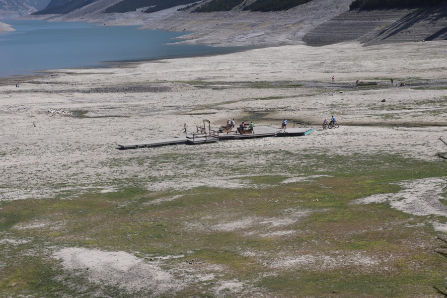 Il lago è talmente scarso d'acqua che la gente ci passeggia a piedi e in bicicletta!
