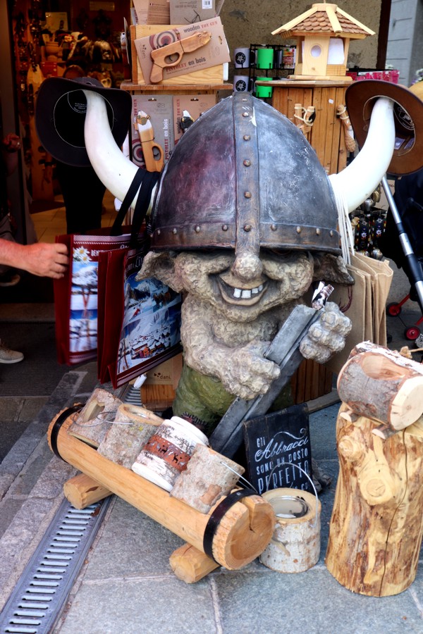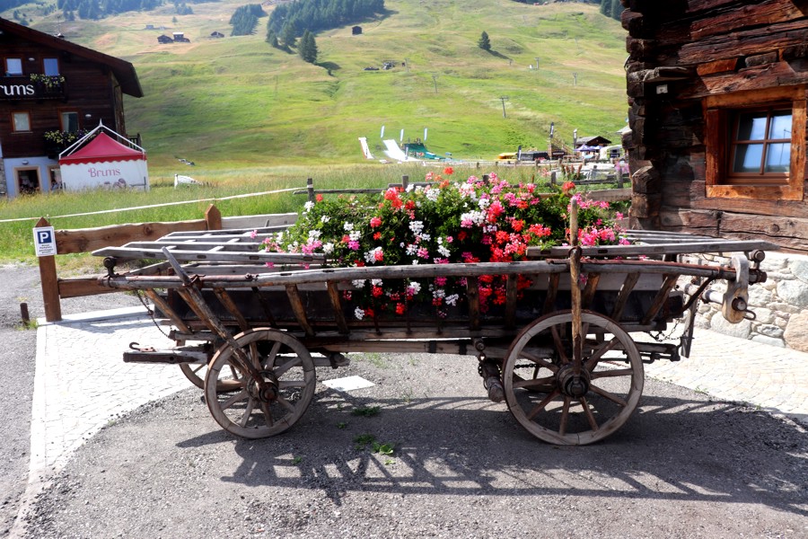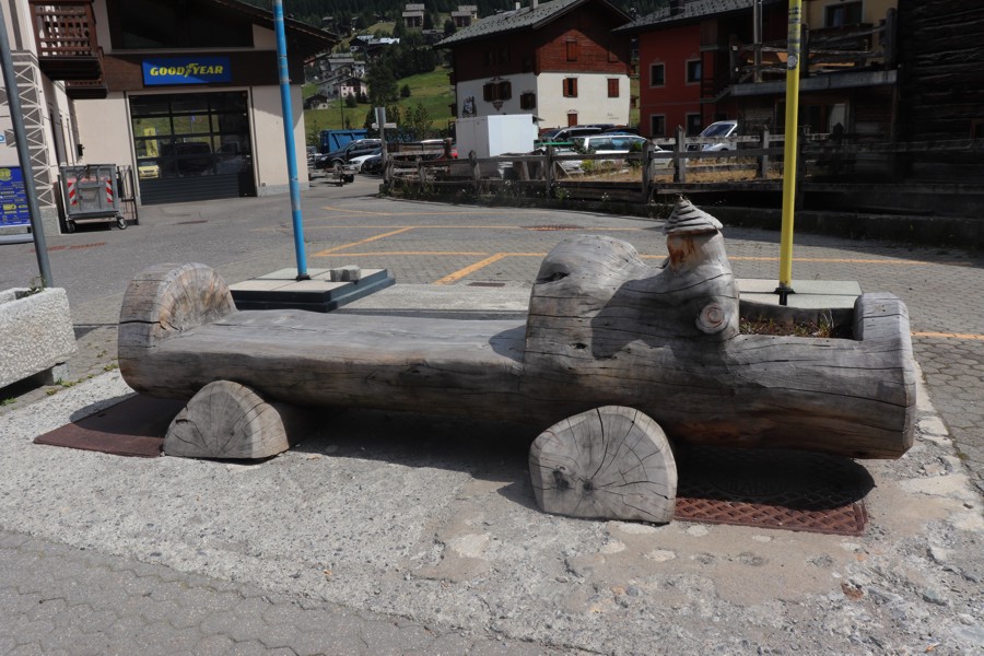 Una bella panchina rustica nel centro di Livigno.