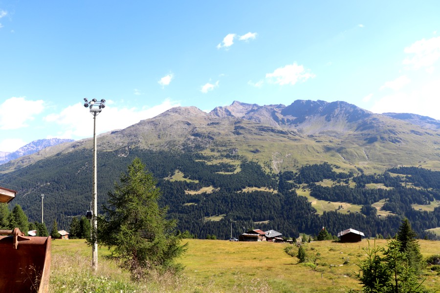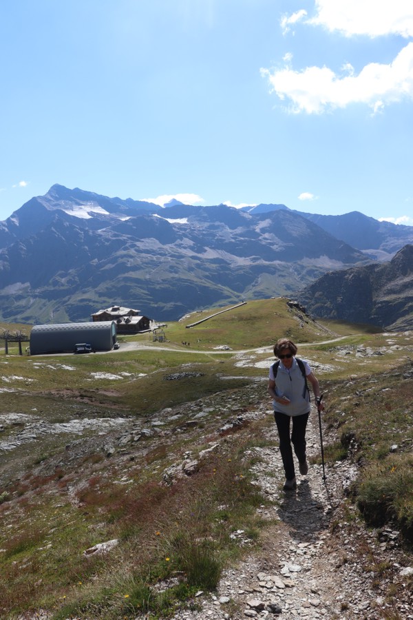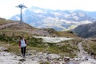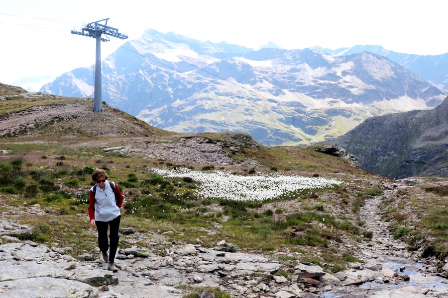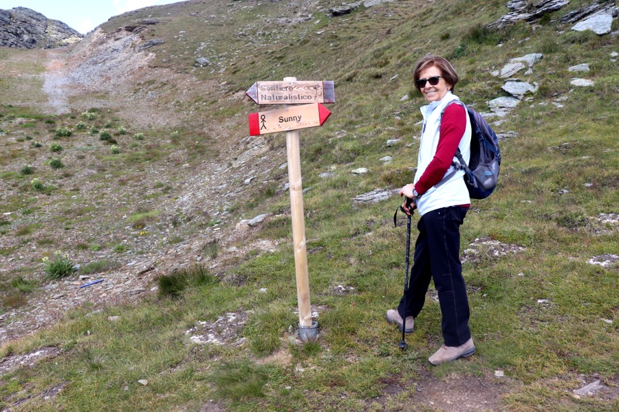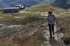 Fausta viene sù agilmente lungo il sentiero. Sullo sfondo le montagne, col Corno dei Tre Signori (3360 mt.), il Sunny Valley e la stazione della cabinovia.