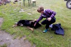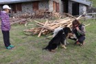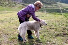 Lasciamo la stalla e andiamo a prendere una boccata d'aria. Fausta familiarizza con Bella, uno dei tre cani di Titti.