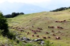 Le vacche hanno abbordato la discesa che le porterà fino al pascolo mentre il mandriano le aspetta per guidarle.