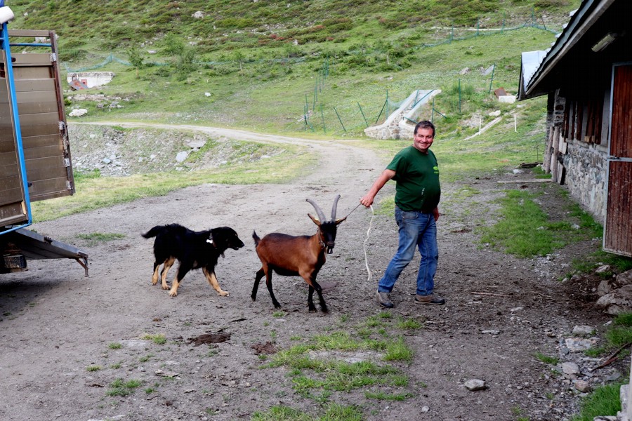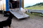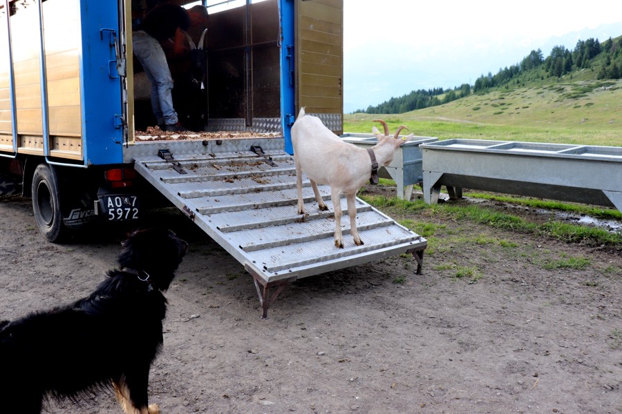 Balù sorveglia attentamente la discesa delle capre dal furgone.