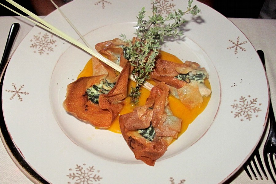 Foto 32/40 - Osteria Il Balivo. Fagottini di Ricotta con Spinacini di Ayas e Salsa di Zucca e Zenzero.