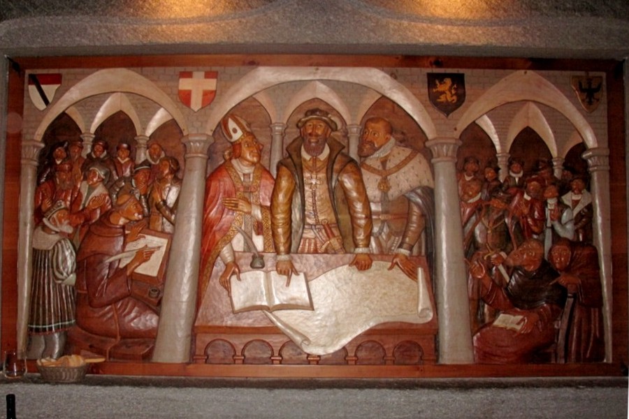 Foto 35/40 - Osteria Il Balivo. Un bel lavoro di ebanisteria che riguarda proprio un balivo che, nella cultura walser, stava a rappresentare un alto funzionario del potere locale.