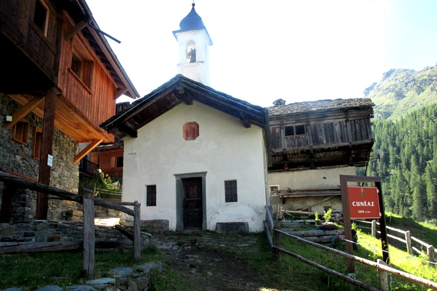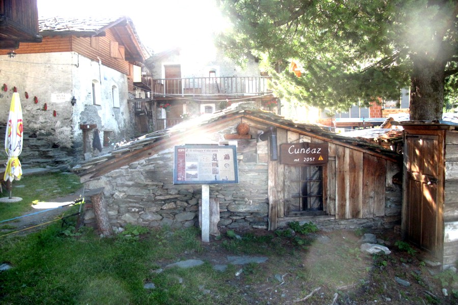 "Situato a 2032 metri, il paese di Cuneaz si trova alle spalle dell'arrivo della funivia che da Champoluc sale al monte Crest ed all'inizio dell'omonimo vallone: invisibile dalla stazione