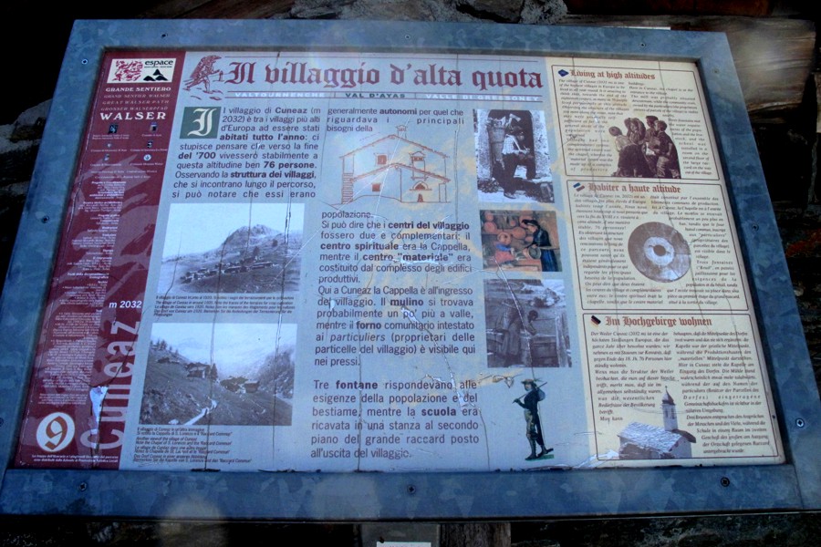 Foto 16/30 - Il cartello informa che Cuneaz appartiene alla cultura walser e fornisce indicazioni sulla struttura e sulle dinamiche della comunità del villaggio in tempi antichi.