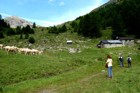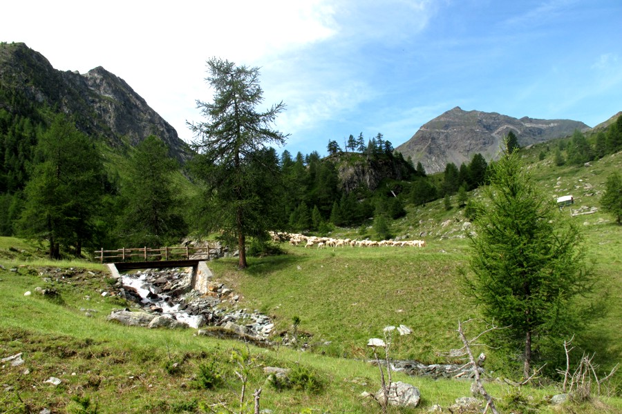 Foto 8/35 - Alpe Nana. Il ponte sul torrente Nana e pecore al pascolo. Sullo sfondo Il Grand Tournalin e a sinistra il Palon di Nana.