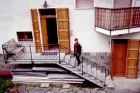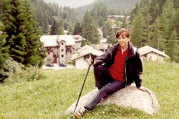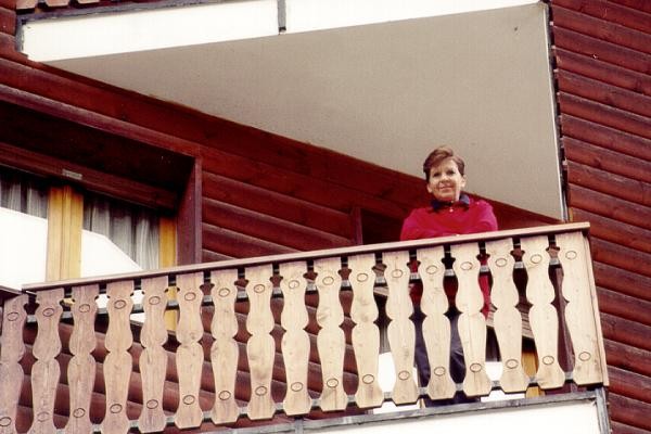 Da sinistra a destra: - Fausta saluta dal balcone. - Poi scende per andare a fare un giretto in paese. - Foto d'obbligo con alle spalle il torrente Evançon. |