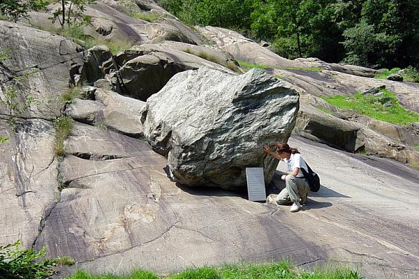 Fausta è intenta a leggere le spiegazioni contenute in una piccola teca relative ai graffiti che si possono intravedere sull'immenso ammasso roccioso