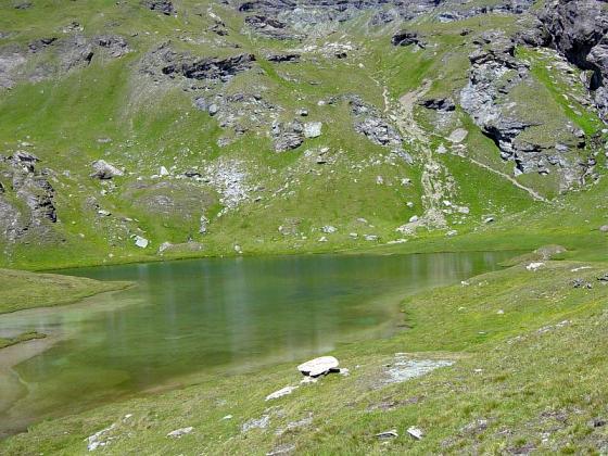 Da qui si vedono distintamente il piccolo Lago Verde (m 2487), a sinistra