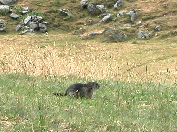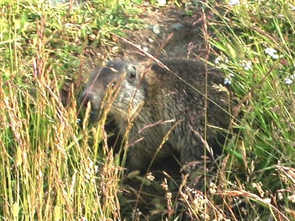 Foto 4/16 - Una giovane marmotta, sorpresa dalla nostra venuta, si nasconde fra l'erba.