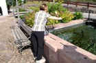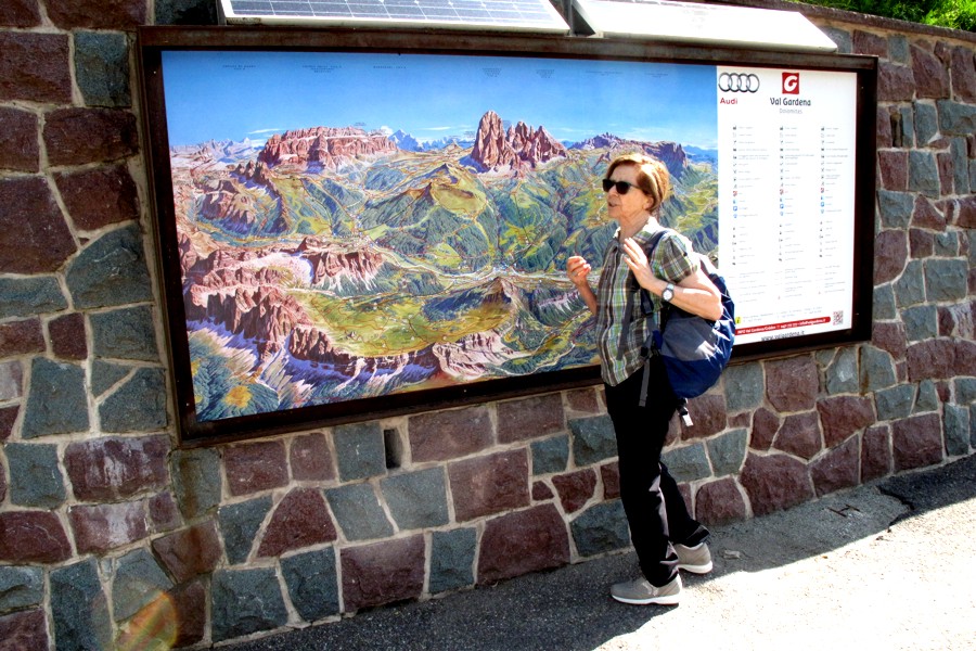 Fausta di fronte ad una riproduzione della mappa della Val Gardena molto più grande di quella che regalano gli uffici