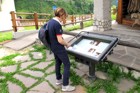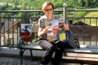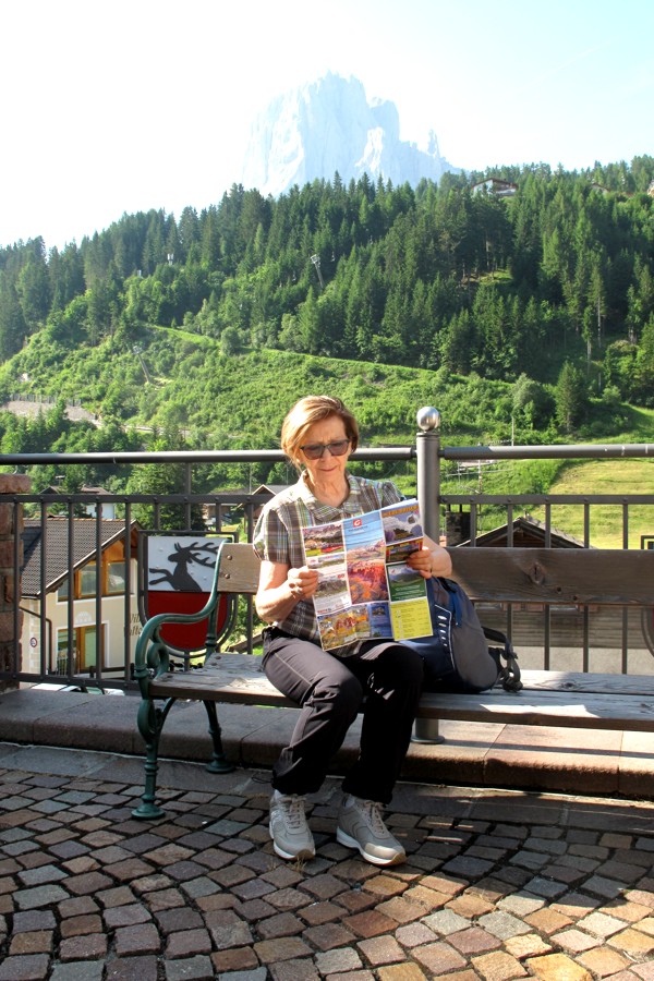 Su una panchina della piazza Fausta consulta la mappa del paese; alle sue spalle la sagoma del Sassolungo avvolta