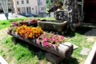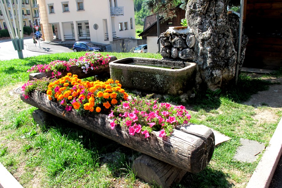 Stiamo tornando verso il centro del paese. Una vecchia fontana abbellita da due tronchi d'albero cavi riempiti con