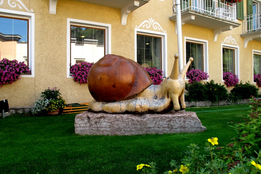 Nel giardino dell'Hotel Posta questa scultura in legno policromo che rappresenta una lumaca.