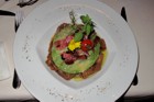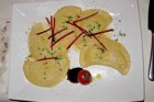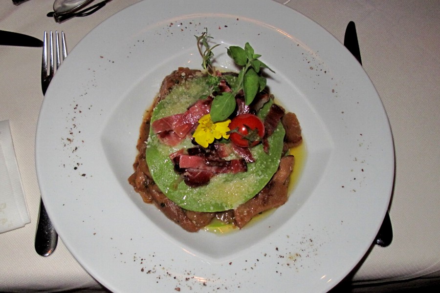 "Raviolo aperto verde ripieno di patate e funghi porcini con burro, speck e parmigiano".