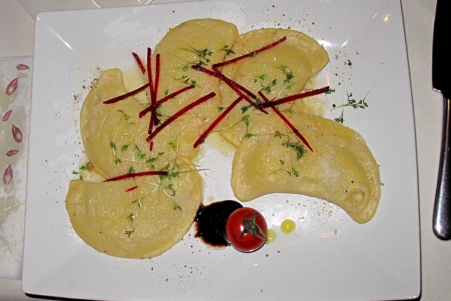 "Mezzelune di patate fatte in casa ripiene di brie, prosciutto crudo e aglio orsino".
