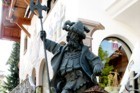 Una scultura posta sull'angolo del fabbricato che rappresenta un